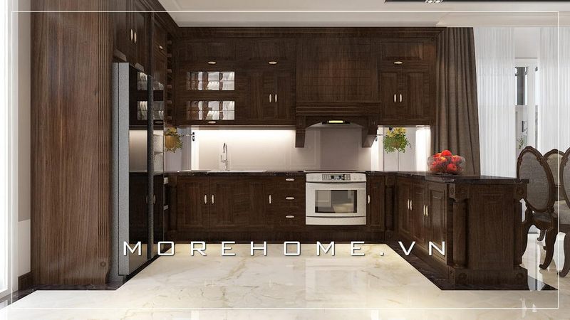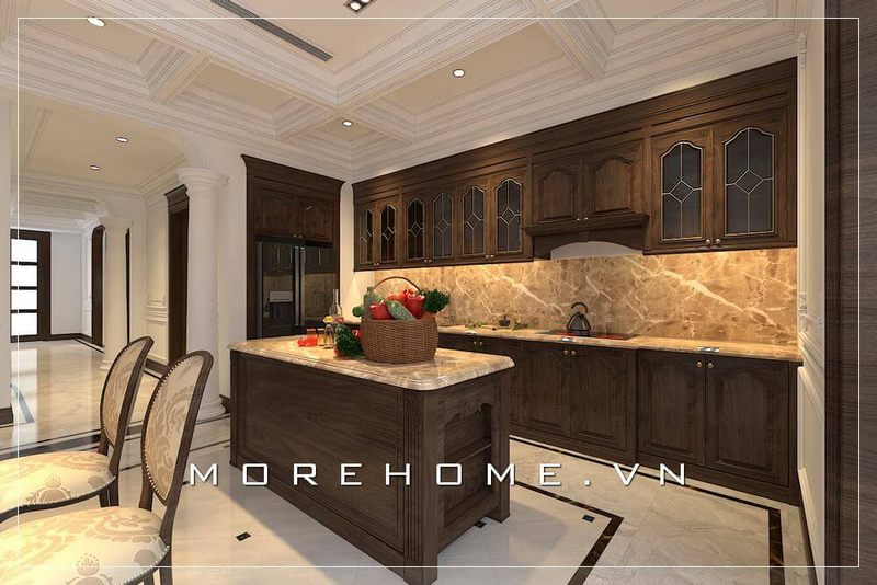 Thiết kế phòng bếp biệt thự với nội thất gỗ cùng thiết bị phòng bếp bếp hiện đại tiện nghi
