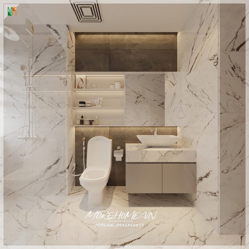 Hệ thống tủ để đồ chống ẩm kết hợp với đá nhân tạo vân mây trắng cao cấp tạo nên một tổng thể không gian thư giãn sang trọng, cao cấp cho gia chủ