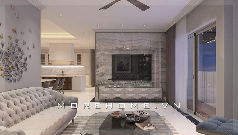 Ấn tượng bởi đá ốp tường màu trắng loang mang đến sự sang trọng, đẳng cấp cho không gian căn phòng cuốn hút mọi ánh nhìn.